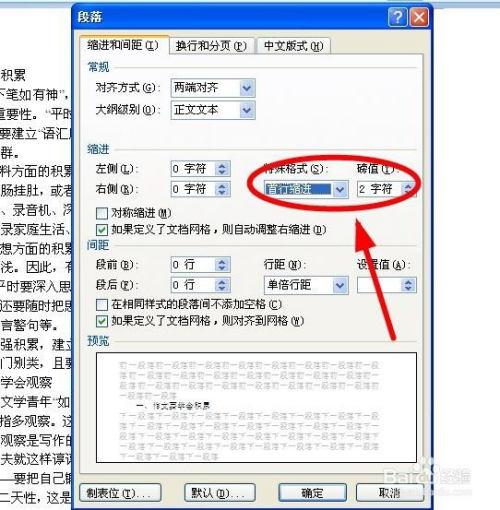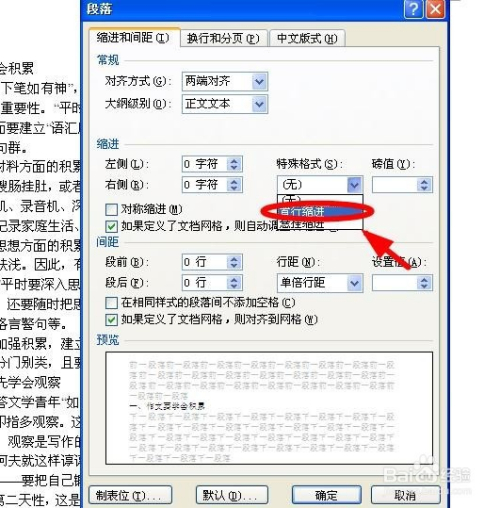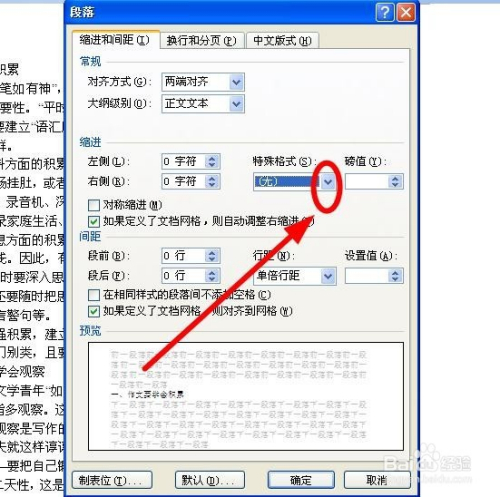 我们在“缩进”选项下面可以看到“特别格局”下面是“无”,要点窜当作中文习惯的“首行缩进”。单击后面的小箭头
