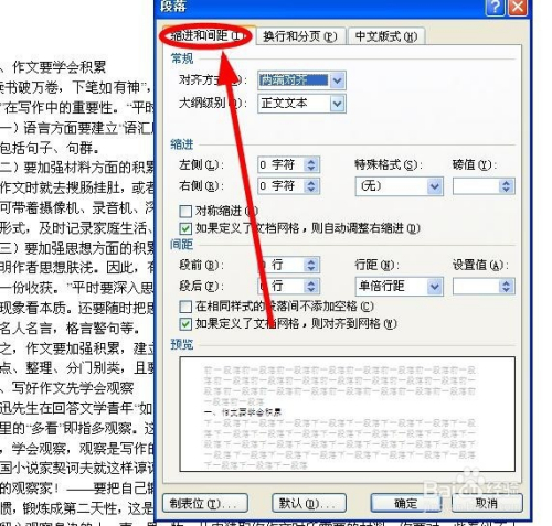 在“段落”对话框,单击“缩进和间距”选项卡