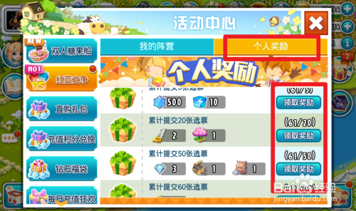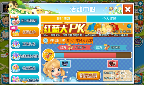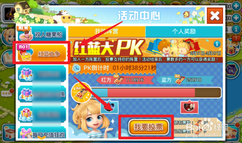 第四步,然后我们在活动中间页面,在左边的活动栏找到红蓝之争活动,然后点击我要投票,如图所示。