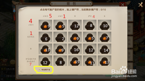 我们完当作之后去找茅山道士,茅山道士在杂货店屠娇娇旁边,可是需要破解尸变阵,我们打开后擦失落边缘的灰尘,破解方式就是算出来各个边缘的值,进行相加,左下角可以看到奇变偶不变,小编给大师全数算了出来,可以看到尸变的处所都是为奇数。此次的为第一行12,第二行345,第三行12,第四行345。
