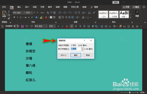 在弹窗里我们将“新文字宽度”设置为“3字符”即可,最后点击弹窗下方的“确定”按钮就可以看到两个字的姓名与三个字的姓名摆布两头对齐了。