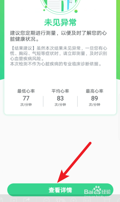 测试竣事后,页面就会显示本身的心率环境,同时给出成果。我们点击下方的查看详情。