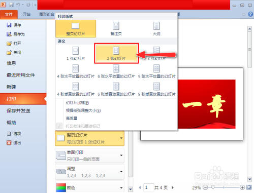 以上是将2张幻灯片打印到一张纸上,若是想把更多张的幻灯片打印到一张纸上,我们在“课本”下方更改打印模式即可,好比“3张幻灯片”、“4张幻灯片”。