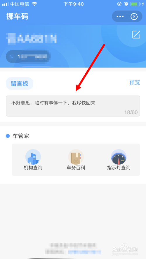 OK,这样操作后,就设置当作功了。最后,我们还可以在 留言板 处,写入 个性留言 。之后就可以把挪车码放在汽车的前档玻璃处,若是需要挪车时,其他人只要用支付宝扫一扫上面的二维码,就会看到我们的 个性留言 。同时,会有第三方平台给我们打德律风挪车。这样可以有用庇护我们的小我隐私。