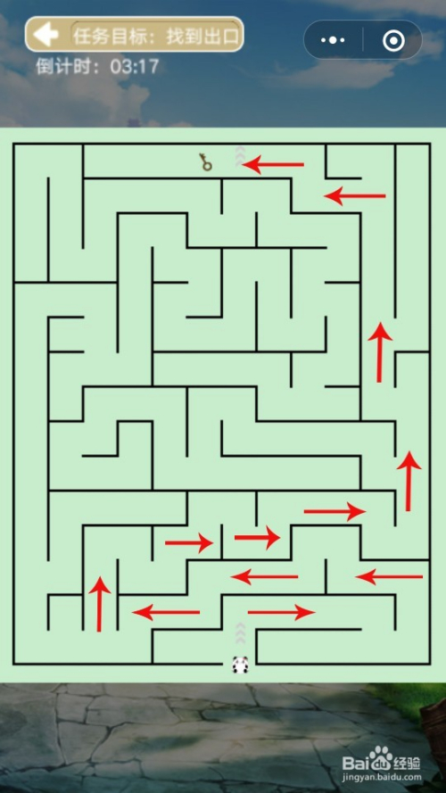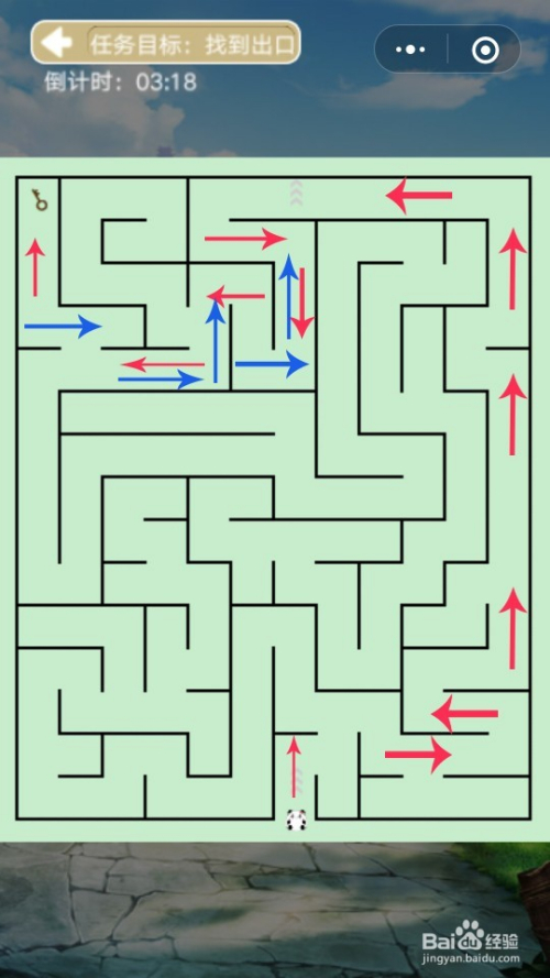 第17关小熊猫标的目的上移动在转弯如图红色箭头偏向移动先取得钥匙,之后在原路返回如图蓝色箭头偏向就能出口