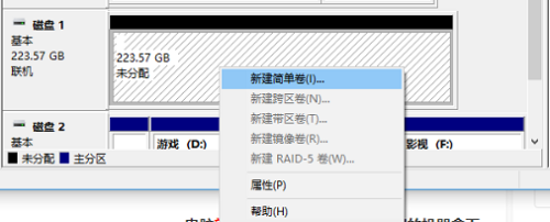右键点击新磁盘,选择“新建简单卷”;