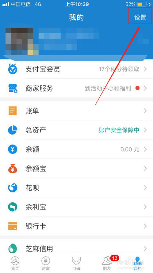 打开支付宝→点击【设置】
