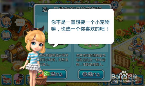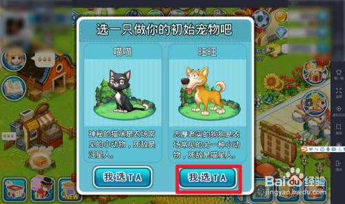 第六步,我们按照本身的喜好,进行宠物的选择,好比,若是你喜好温柔神秘的猫咪,就可以第一个。小编比力喜好小狗,所以点击了狗狗下面的“我选它”,如图所示。