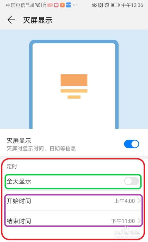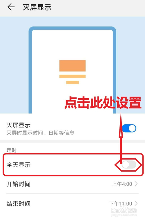 在【灭屏显示】功能页面中找到【按时】功能设置栏。有两种显示方式,一种是全天显示,一种是时候段显示。