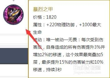 下一步我们可以出暴烈之甲这件装备来增添我们1000的生命值和220的护甲,这样我们的英雄就很是肉了。