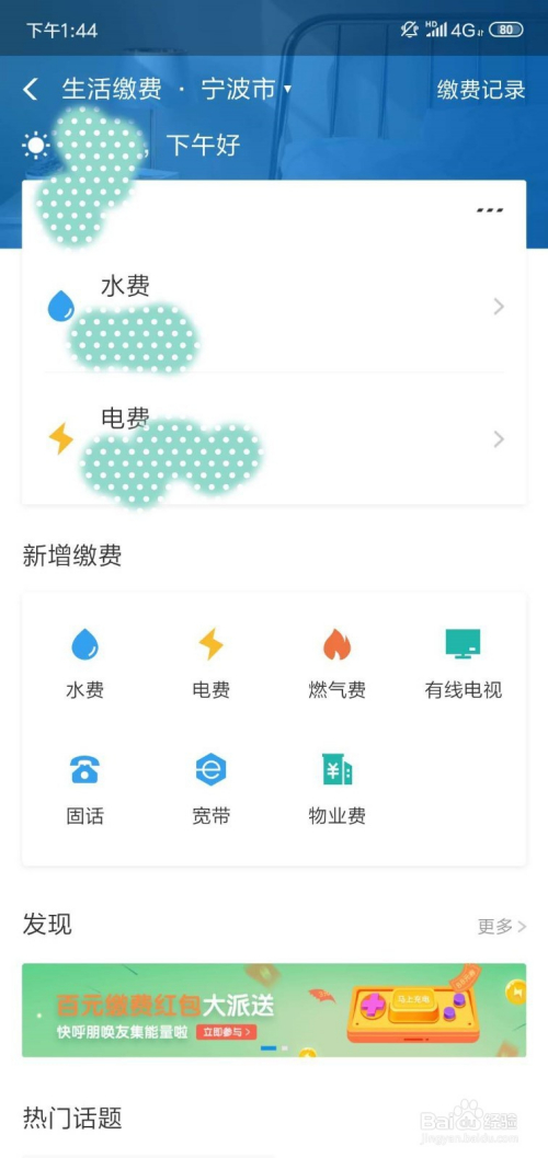 进入页面,我们能看到船脚和电费,好比交电费,点击一下;