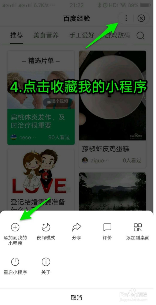 然后我们把小程序添加到我的小程序一栏中去,便利今后直接查找。点右上角的三个点,然后再找到左下角-添加到我的小程序-,点击后会跳出一个利用小申明。