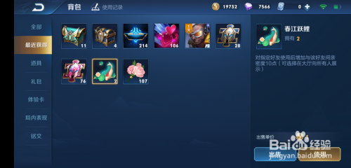 然后我们可以在背包,然后在比来获得中找到这个春江跃鲤道具。
