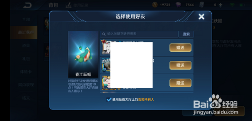 最后我们点击利用,然后我们可以选择老友利用,我们可以选择在大厅上方显示出来,这样所有人都可以看到我们给这个老友送了春江跃鲤。