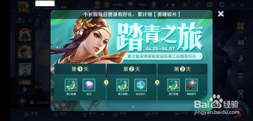 首先我们打开王者荣耀,然后我们就可以看到有踏青之旅活动,可以领取皮肤碎片铭文碎片和春江跃鲤道具的呢。