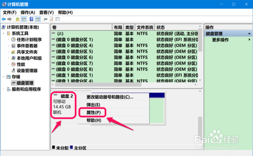 在计较机办理 - 磁盘办理 对应的右侧窗口中,我们右键点击【可移动磁盘 2 】,在右键菜单中再点击:【属性】;