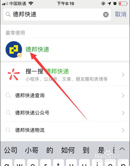 接下来输入德邦快递查询,查找其官方公家号,如下图所示,找到匹配的进入。