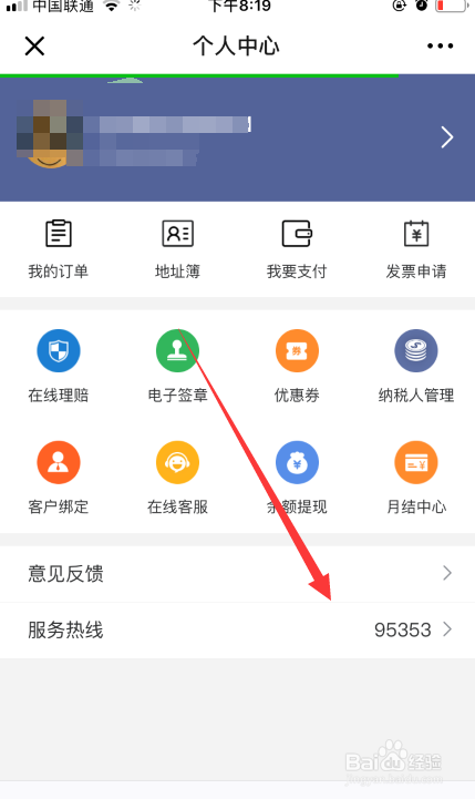 接下来系统主动进入小我中间,如下图所示在页面的最底部有客服办事热线。