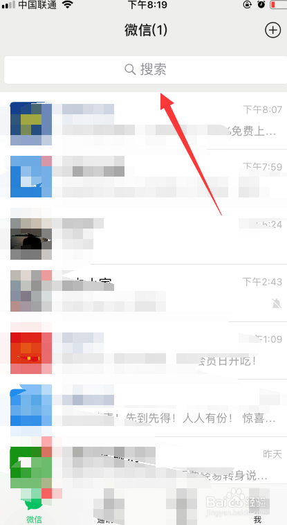 首先进入微信进口,如下图所示。点击页面上方的搜刮进口。
