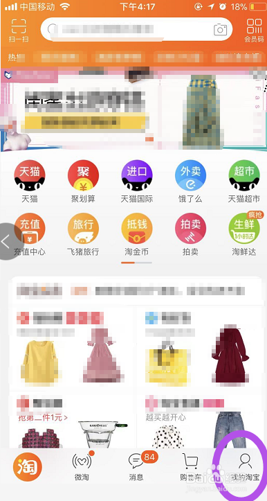 首先,打开淘宝app,进入淘宝app首页。在淘宝首页内点击最右侧的菜单我的淘宝。