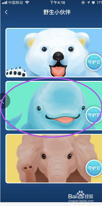 然后会呈现三种野生小伙伴可以备领养,别离是海说神聊极熊,海豚和大象,选择一个喜好的小动物吧。