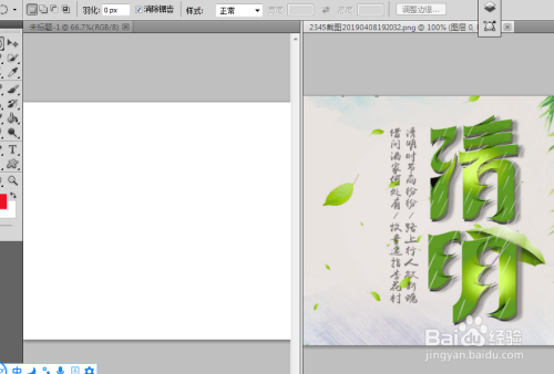 用移动东西,我们把那张图片拖到空白文件上,然后再找一张清明节时分桃花盛开的图片也把他拖动在我们的文件上,点击CTRL加t键进行大小调整到合适的尺寸
