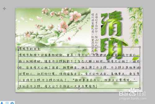 然后在图片的下方,我们写下了清明节的来历,把清明节的来历故事在这里用手写体写出来,最后,进行大小图片的排版,使它与整个手抄报相协调。这样一个关于清明节的手抄报就建造好了