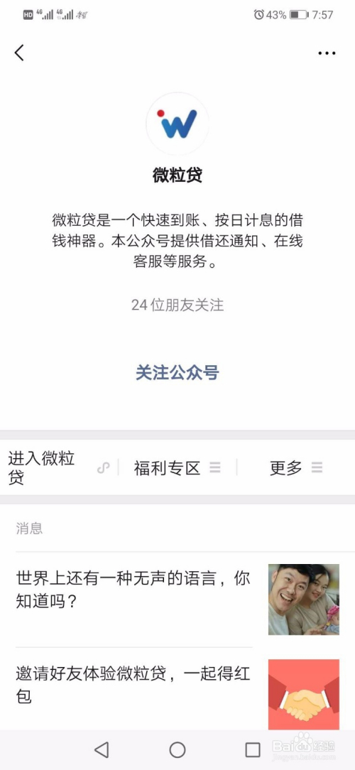 我们点击上方的"存眷微粒贷公家号,当即领福利",就可以扫描二维码存眷了。