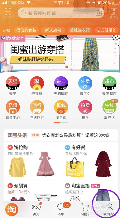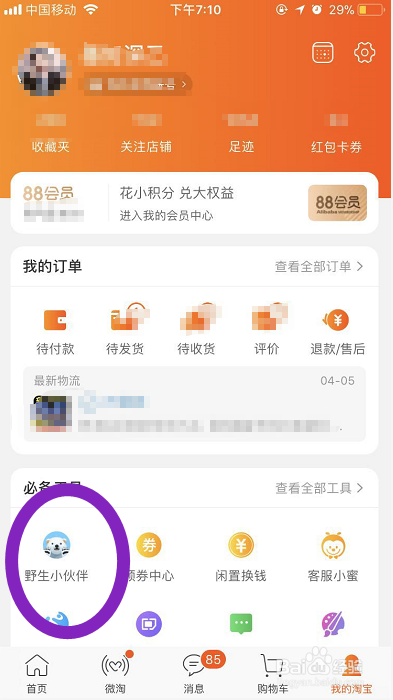 进入到我打的淘宝页面之后,可以鄙人图所示的位置处找到野生小伙伴按钮,点击野生小伙伴菜单。