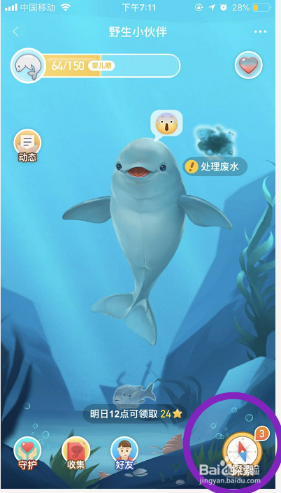 之后就会看见领养的小动物了。在该页面的右下角有一个叫做摸索的按钮,点击这个按钮。
