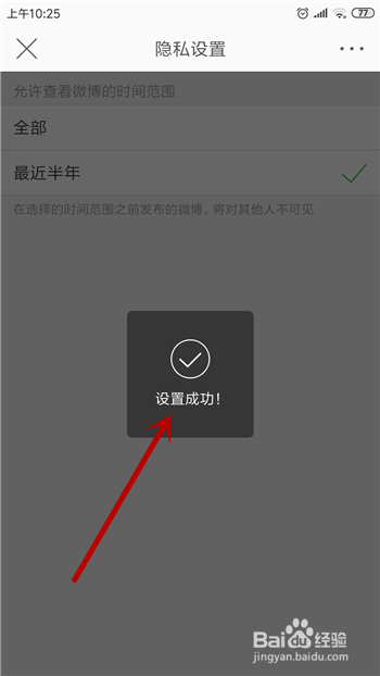 选择好后会提醒【设置当作功】,这样别人看我们的微博动态就只能看到半年之内的。