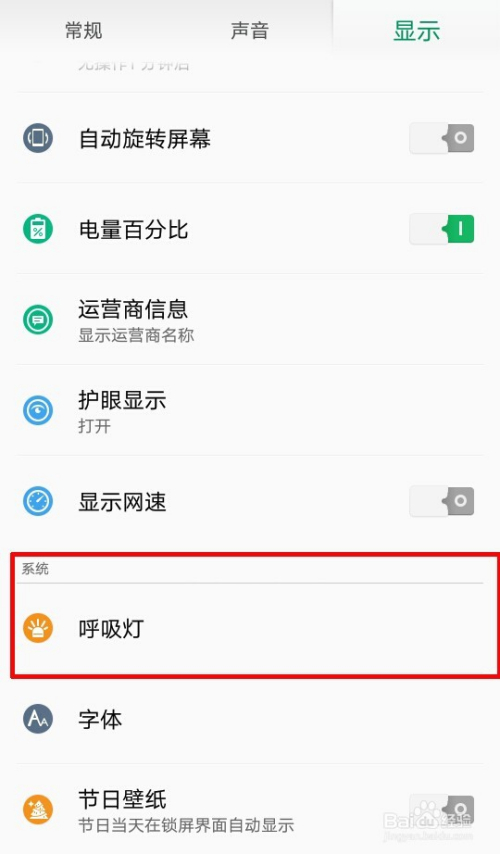 接着选择显示,滑动到有呼吸灯菜单中