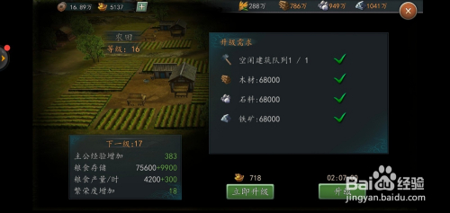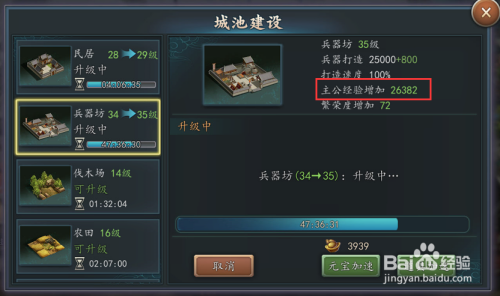 进级城池建筑可以获得本家儿公经验,进级的建筑品级越高,获得的本家儿公经验越多。