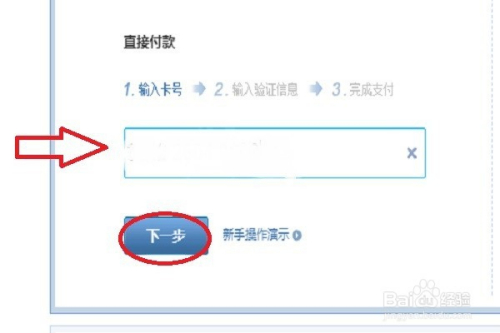 我们在箭头所指框框里填写银行卡号,点击下一步后,完当作支付即可。