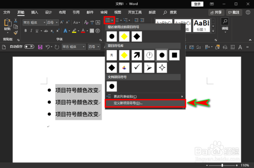 在“段落”选项组里找到“项目符号”选项,然后点击旁边的小三角打开其下拉菜单,选择里面的“界说新项目符号”选项。