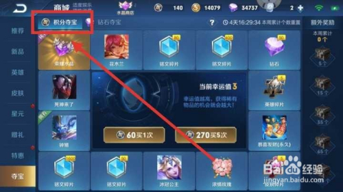 第四步,进入夺宝界面今后,我们看到有积分夺宝和砖石夺宝,我们想要抽取荣耀水晶,那就点击按钮【积分夺宝】,具体如下图