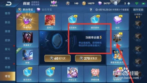 第五步,我们在积分夺宝界面可以看到良多道具,此中就有荣耀水晶,界面有14个商品,半斤八两于抽取工具是14中一,界面有两种弄法利用积分(点卷采办1比10)【60买一次】和【270买5次】,每抽取一次获得幸运值加1,当幸运值满361点必中荣耀水晶,然后幸运值清0,其实抽取这个积分夺宝,,网上说什么整点去抽,什么卡之类的,都是没有效的,完全看脸,建议采办270买5次那种,廉价30积分,具体如下图