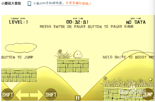 第二集小蘑菇回家的路更为艰险一些,需要先上台阶再跳壕沟,操作难度稍有加大,你可以用以上操作方式进行跳跃进步,还可以用电脑上的⬅️➡️键帮忙小蘑菇进步,用鼠标点画面右下角的"jump"帮忙小蘑菇跳跃。