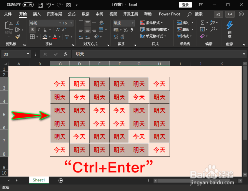 接着我们在表格的第一个空白单位格中输入“明天”,再同时单击键盘上的“Ctrl+Enter”键,这样所有空白单位格中都有了不异的内容,即“明天”。如图所示: