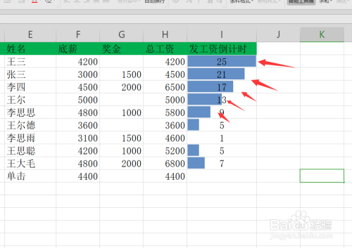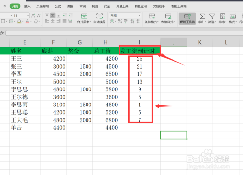 输入文字内容之后我们首先在最后一列添加一个发工资倒计时页面,然后输入一些数值,如下图所示。