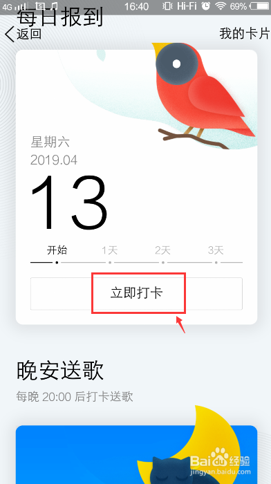往下滑动页面,到了晚上20点今后,还可以点击【打卡送歌】。