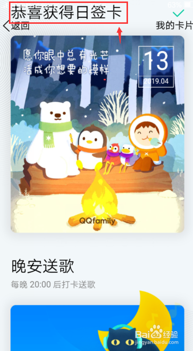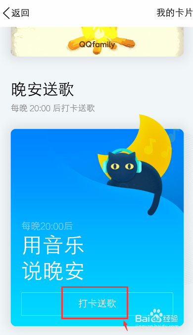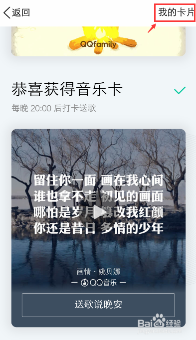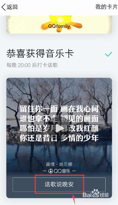 打卡当作功后,就会获得音乐卡,到时可以点击【送歌说晚安】发给QQ老友。