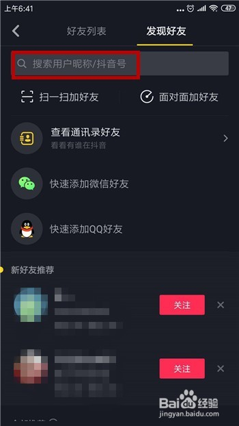 或者我们知道老友的抖音号或者昵称可以搜刮,在发现老友中点击上方的【搜刮栏】。