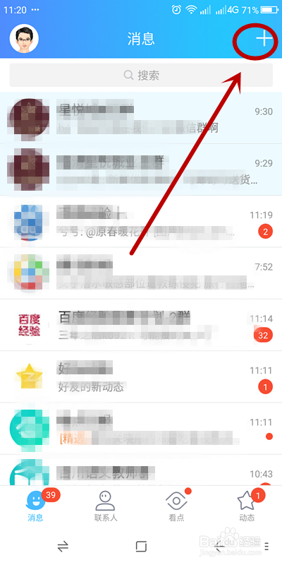 在QQ首页,找到右上角的“+”单击