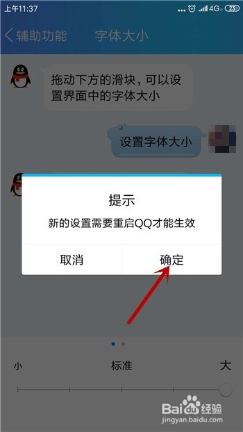 想要生效点窜字体的大小必需重启QQ,点击【确定】。