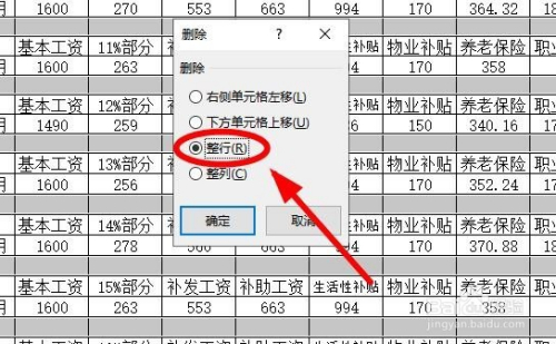 在“删除”对话框中,勾选“整行”后单击“确定”