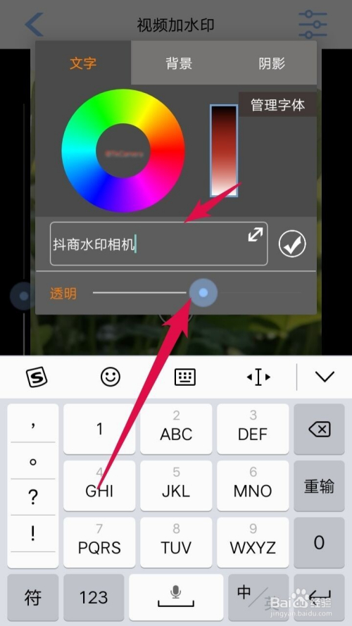 进入文字设置页面,输入文字,字体设置、字体颜色选择、样式调试,完当作后点击“√”。