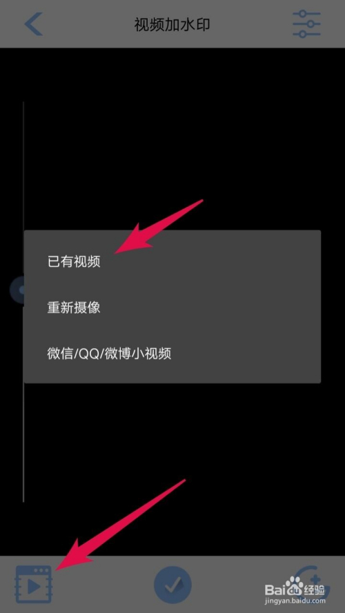 点击左下角按钮,将会显示三个选择按钮,点击已有视频。
