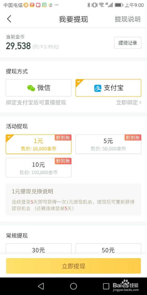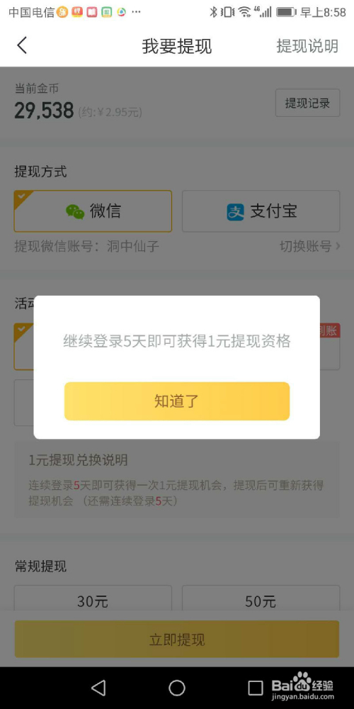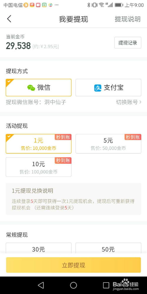 六、再次提现,点击“当即提现”,会呈现下图二环境,这很正常,比及提现期再如上述方式提现。