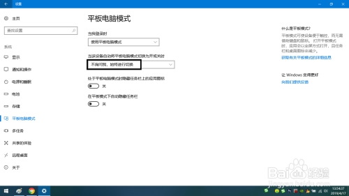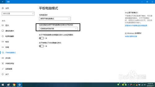 要右侧的平板电脑模式参数中在当该设备主动将平板电脑模式切换为开或封闭时的栏下点击下拉框。